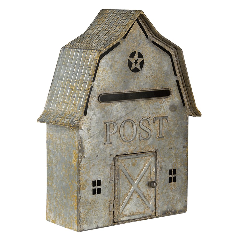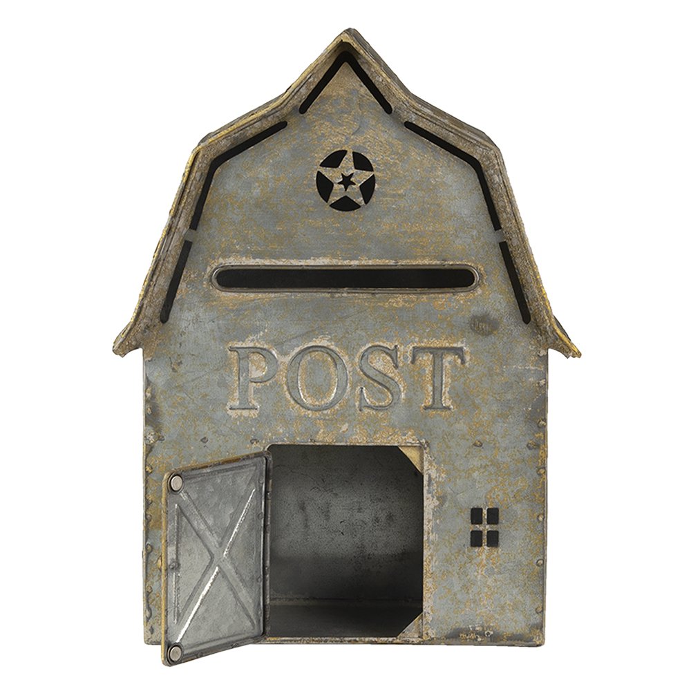 Letterbox 26x11x35 cm grauer Metall -Wall -Briefkasten. Graues Metall -Buchstabenbox mit dem Text „“ Post „“ „auf der Vorderseite und der Form einer Scheune